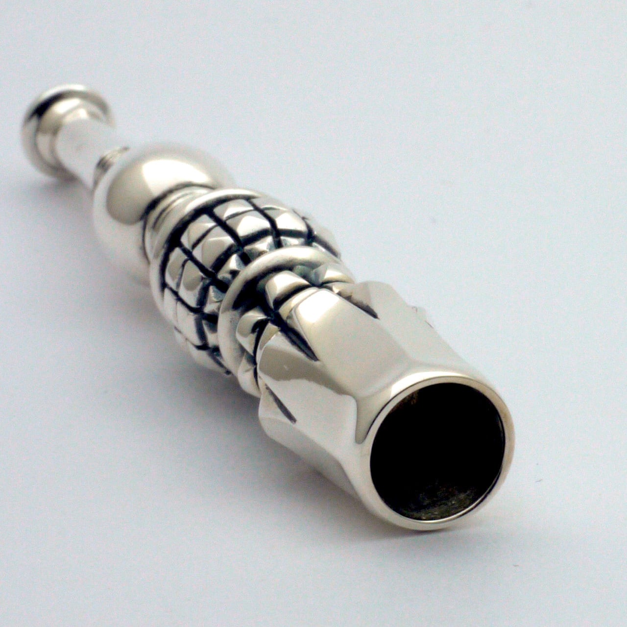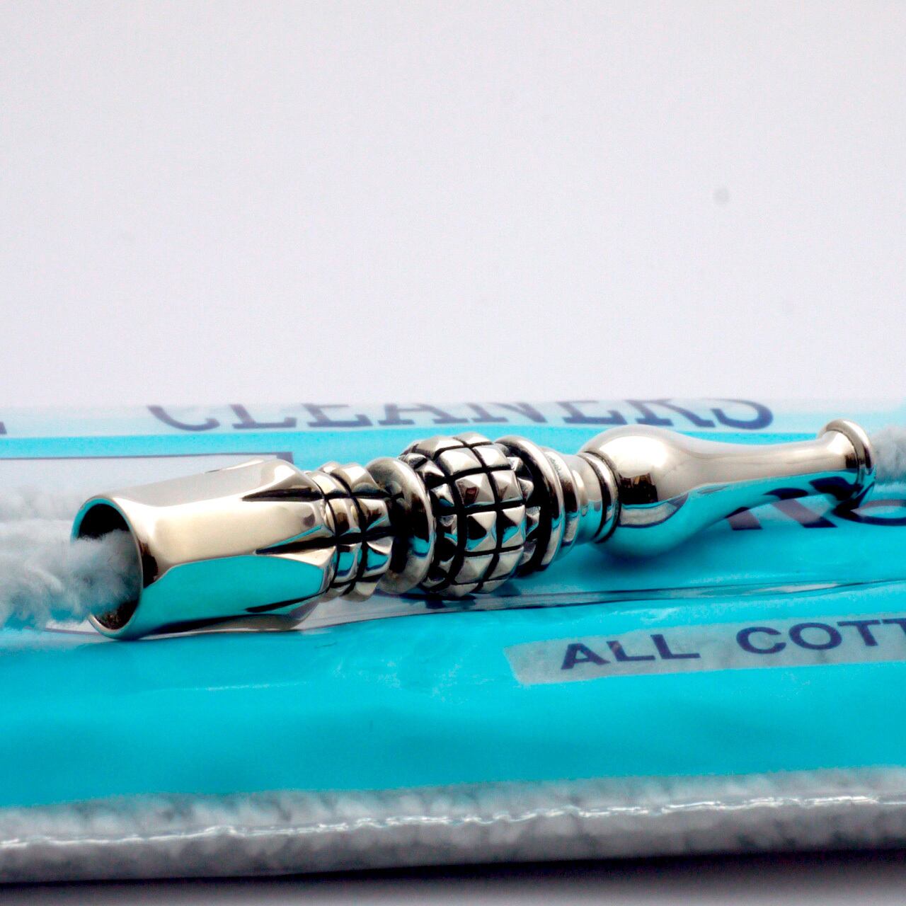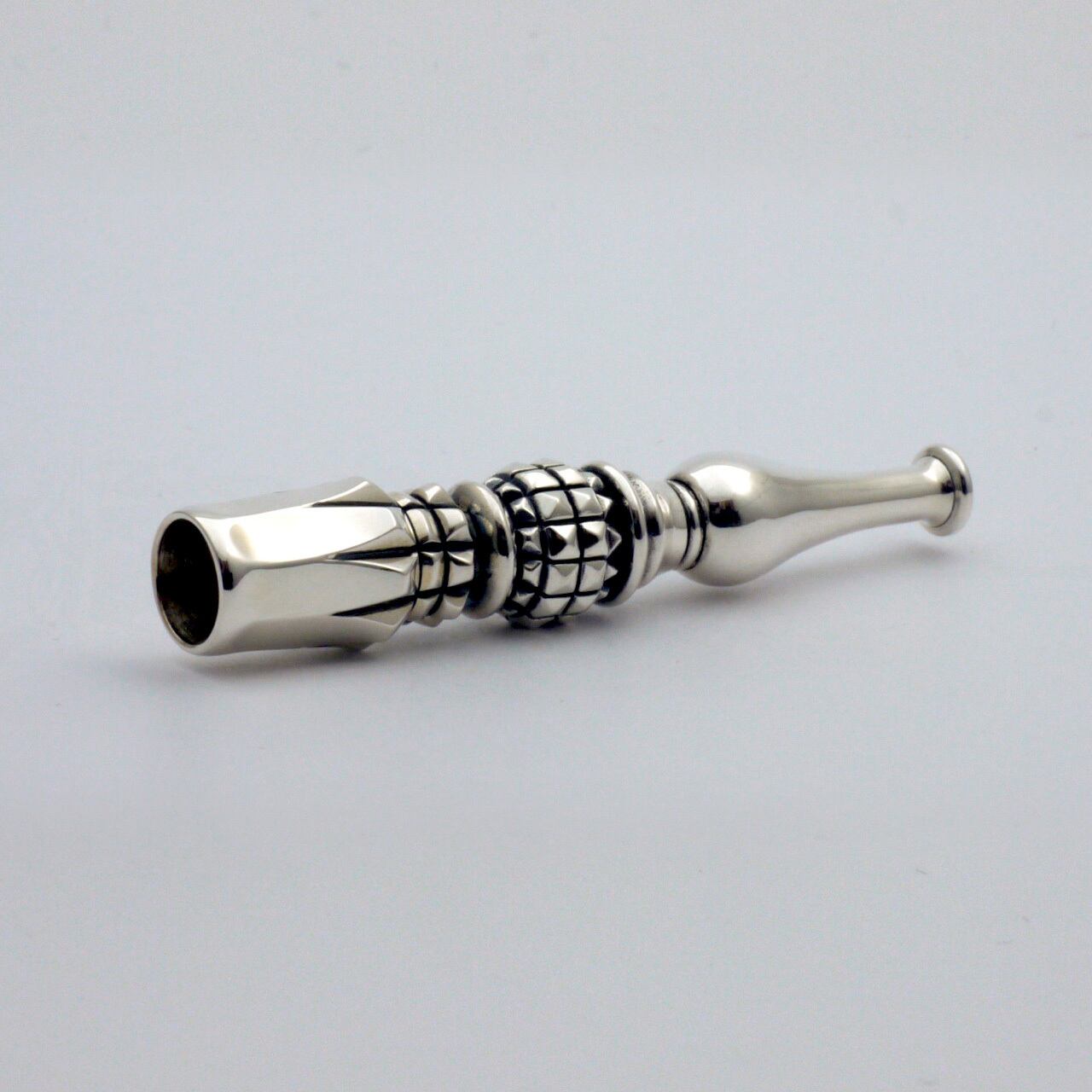 【タバコの差し込み口について】ホルダー部分の内側は、ビジュアル的には 鏡面仕上げをしたい所なのですが、差した煙草とかみ合うように、あえてツルツルにしていません。レギュラーサイズのホルダーの内寸は入り口は9.5mm以上~10mm以下にして、突き当たり数ミリの奥行きをテーパードさせ 「グっと」手応えを感じるように毎回微調整して制作しています。四皇の髑髏火焔は手巻きも市販も入るよう入れやすくした分、奥行きを深くして「差し応え」の安定に工夫しました。とても気持ち良い「入れ心地」です。