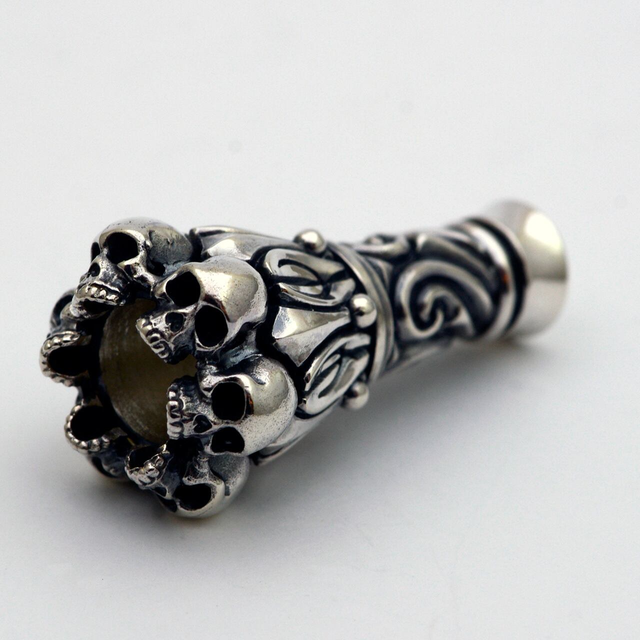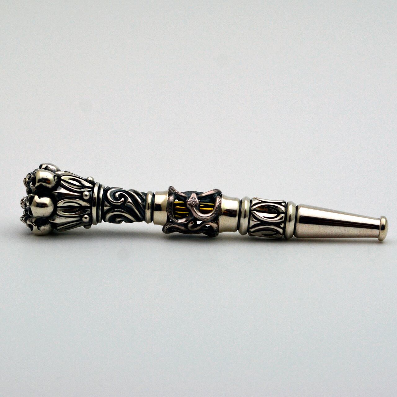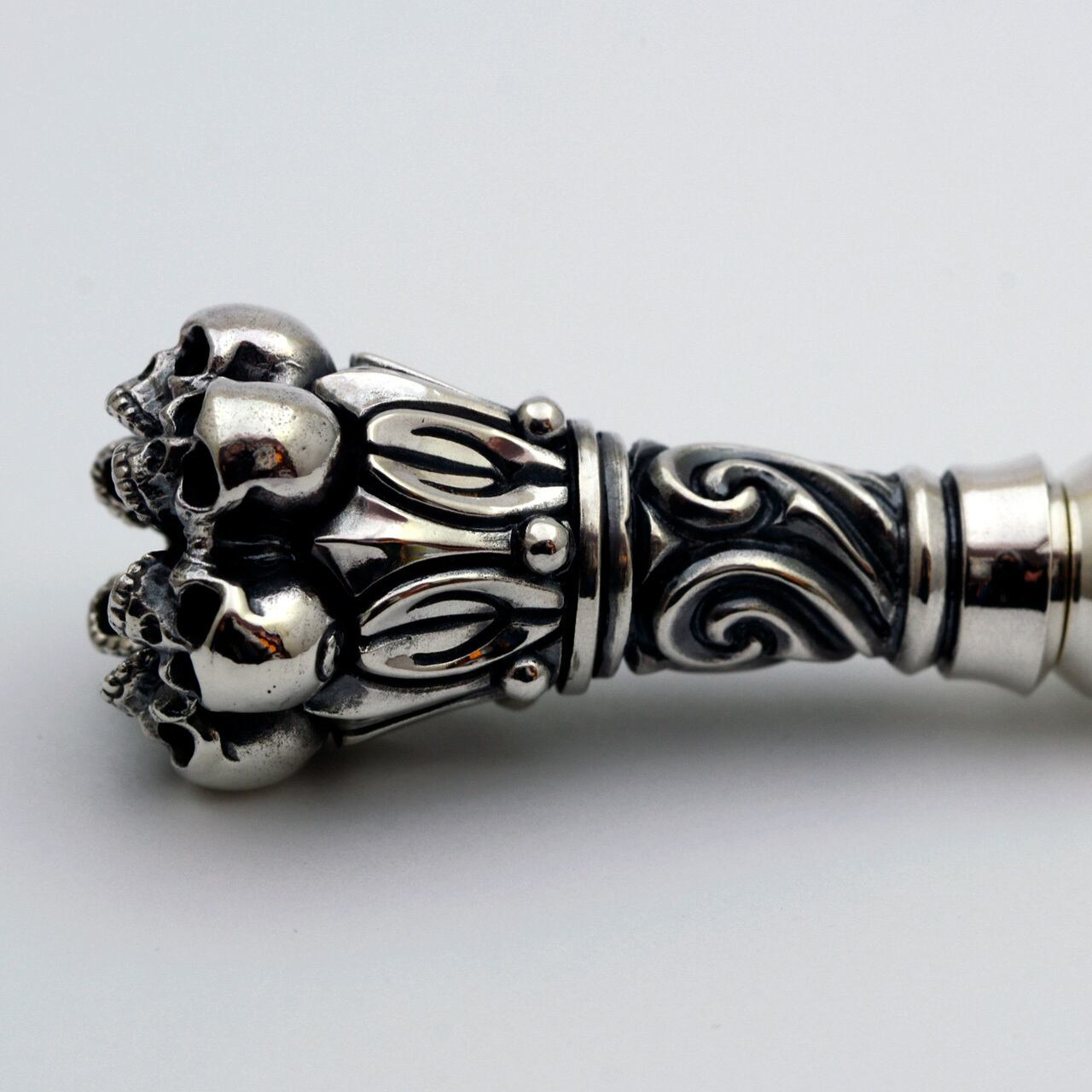 【髑髏の環・輪廻について】「髑髏の環」の生まれ変わりという意を込めて命名。一体型として成り立つ完成度の高いデザインを3ピースの構成にしているところが巧みです。彫り込み、デザイン、シンプルな機能美の絶妙なバランスを模索した令和版「髑髏の環」。その輪廻に合わせてシェイプした蛇の羅宇とミニ黒檀羅宇をプラスした全部入りセットです。羅宇を着せ替えて3タイプのシガレットホルダーを楽しめます。